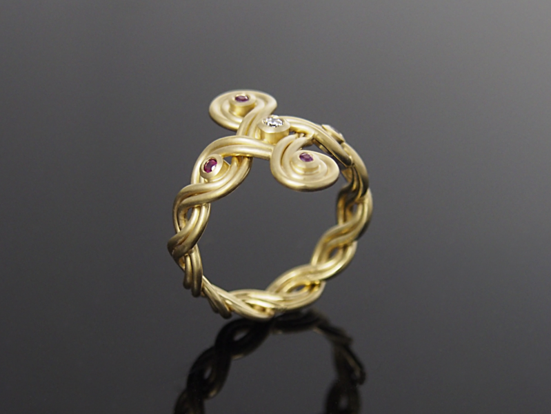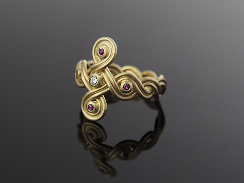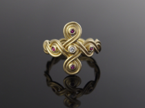 Ein handgearbeiteter Ring aus 750/- Gelbgold mit 4 Rubinen und 1 Brillant 0,03ct TW/VS.