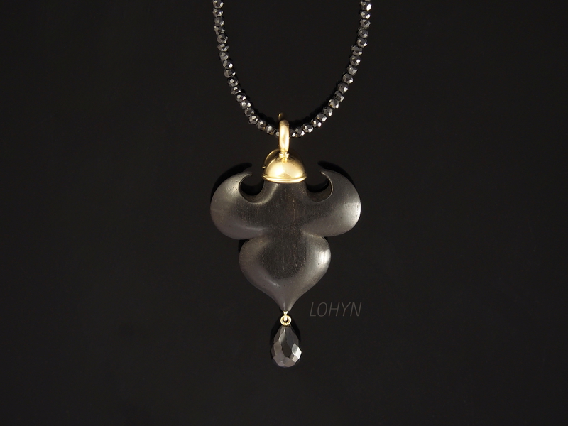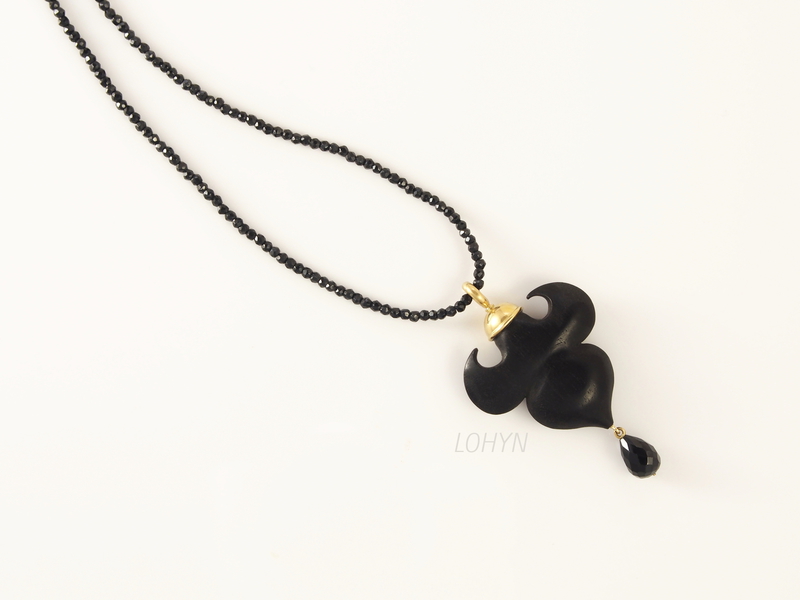 Anhänger aus Ebenholz, 750/- Gelbgold und Spinellbriolette.