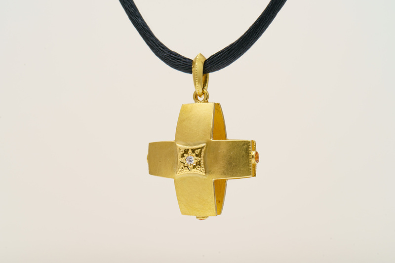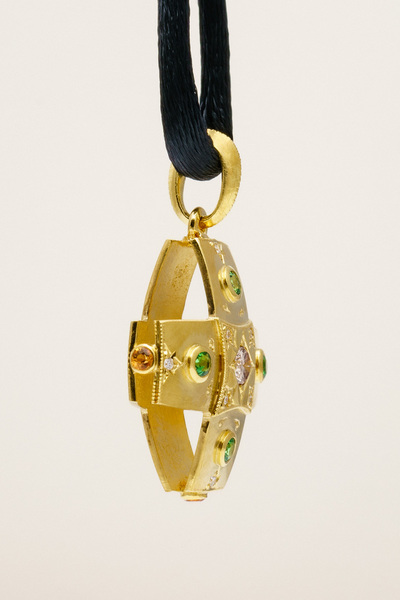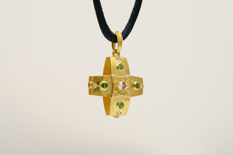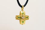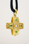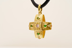 ALs Einzelstück sehen sie einen 750/- Gelbgoldanhänger Kreuz mit Brillanten, Tsavorithen, Saphiren und Zierverschnitt