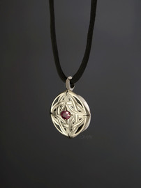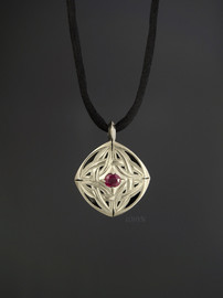 Schön verziertes Medaillon aus 750/- Weißgold mit Rubin und schwarzem Feueremail.