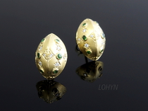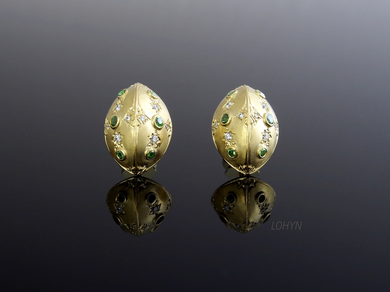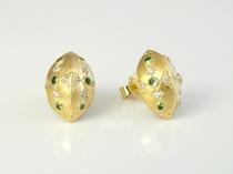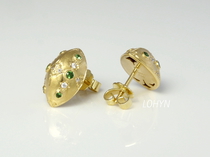 Ohrstecker aus 750/- Gelbgold mit 12 Tsavoriten (auch Tsavolith, grüner Granat) und 16 lupenreinen Brillanten im Zierverschnitt.