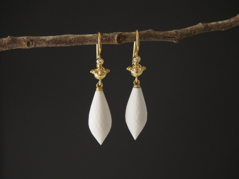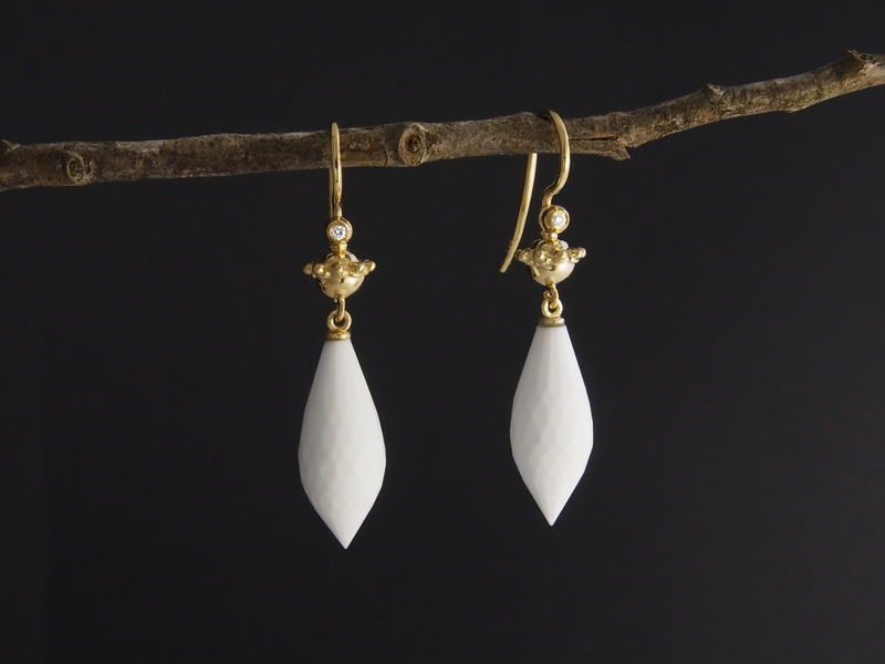 Porzellanopal-Spitzpampeln (Cacholong) und zwei lupenreinen Brillanten.
