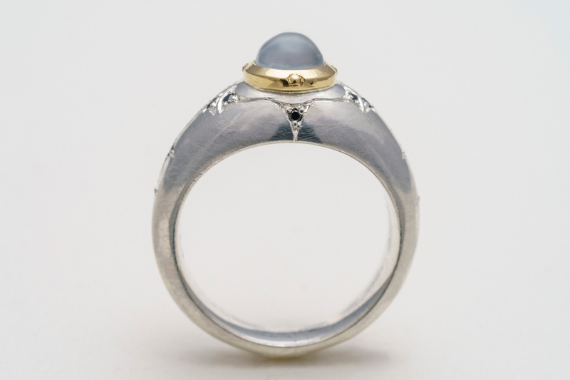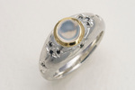 Ring in 925/- Sterlingsilber mit Mondstein in einer 750/- Gelbgoldzarge und Zierverschnitt mit schwazen Brillanten