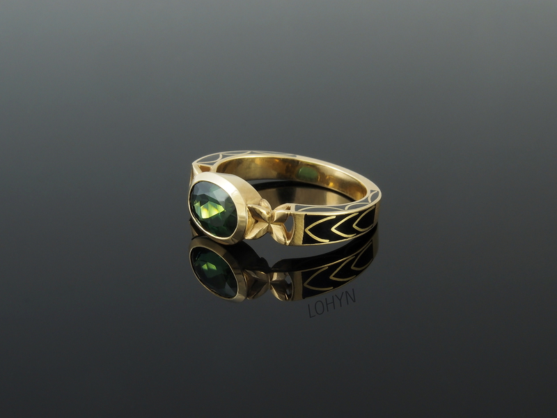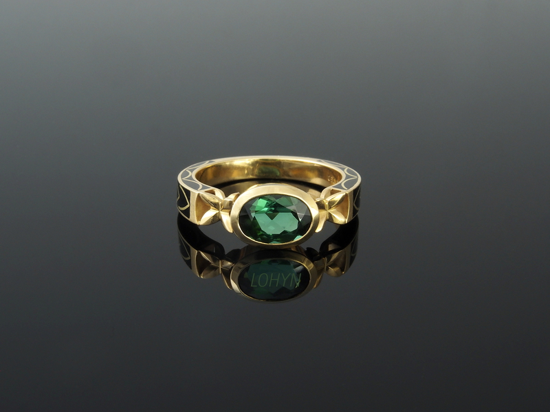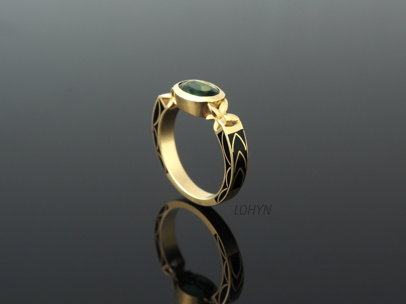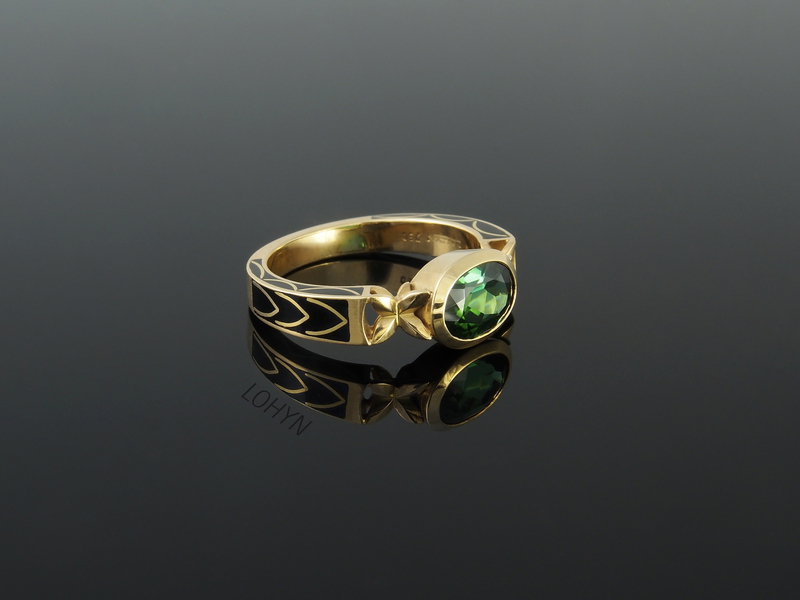 Ring aus 750/- Gelbgold, schwarz emailliert mit grünem Turmalin. Der Turmalin hat ein Gewicht von 1,64ct.